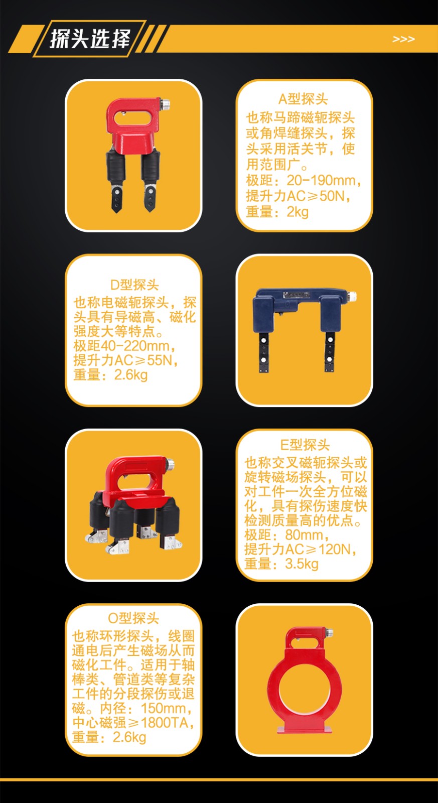 (1)A型探頭:也稱馬蹄磁軛探頭或角焊縫探頭,探頭采用活關節,使用范圍廣。極距:20mm—190mm,提升力AC≥50N,重量:2kg;