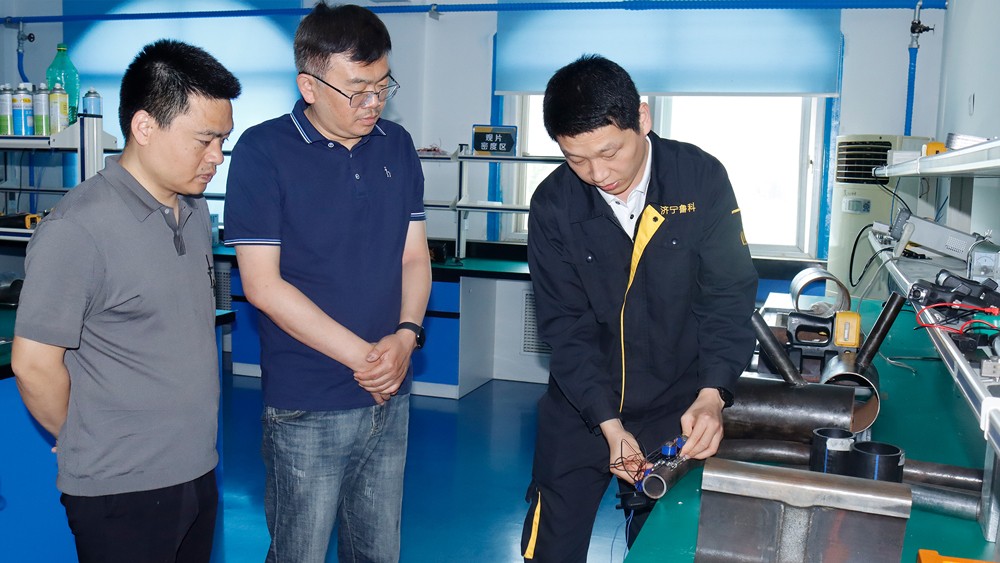 隨后我公司薛建祥總經理陪同陳副院長一行參觀我公司綜合辦公樓、研發生產中心、埋地管道實訓基地、工程公司辦公樓,詳細了解了我公司在便攜磁粉探傷儀、ACFM交流電磁場檢測儀、腐蝕電磁測厚機器人等產品的研發、生產過程,對我公司在產品研發方面的工作表示認可,并規劃了雙方要下一步交流合作的方向,對我司子公司工程公司在埋地鋼制管道及PE管道的取得的檢測成績給予贊賞。