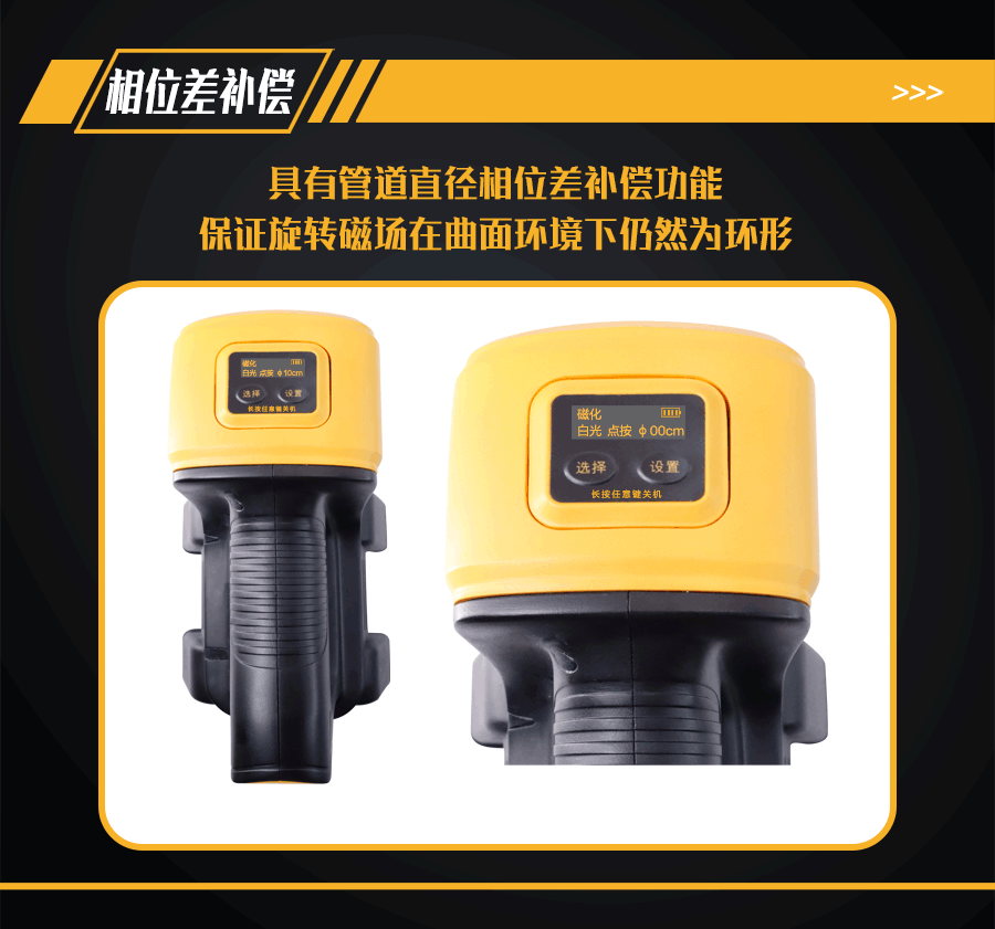 10、管道直徑相位差補償功能;檢測不同直徑管道,可在鋰電池電源OLED顯示屏上進行直徑選擇,設置對應管道直徑的相位差補償,保證旋轉磁場在曲面環境下仍然為環形;