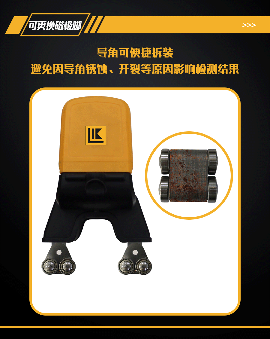 7、每個磁極腳安裝4只軸承,步進探傷無阻力;每個磁極腳可自行便捷拆裝、更換;