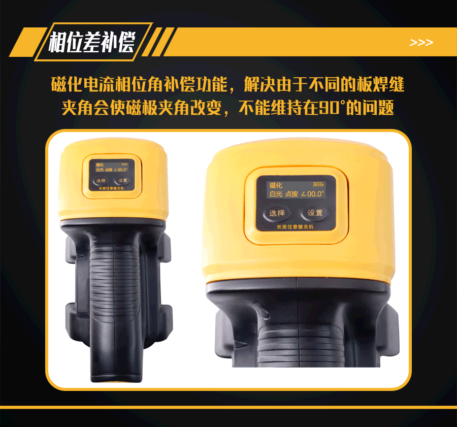 10、磁化電流相位角補(bǔ)償功能;檢測(cè)不同夾角度的角焊縫,可在鋰電池電源OLED顯示屏上設(shè)置需要探測(cè)的工件夾角,解決由于不同的板焊縫夾角會(huì)使磁極夾角改變,不能維持在90°的問題;