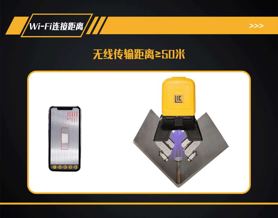 11、探頭內(nèi)部裝有500萬像素?cái)z像頭,手機(jī)、平板電腦或AR眼鏡等手持終端安裝APP軟件,通過Wi-Fi與探頭鏈接,手持終端實(shí)時(shí)顯示探傷狀態(tài);